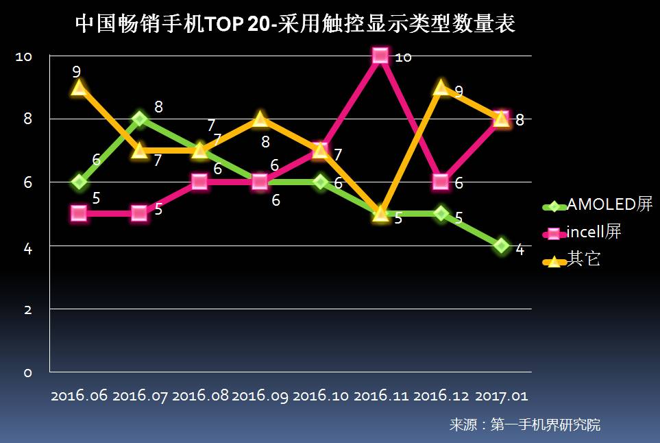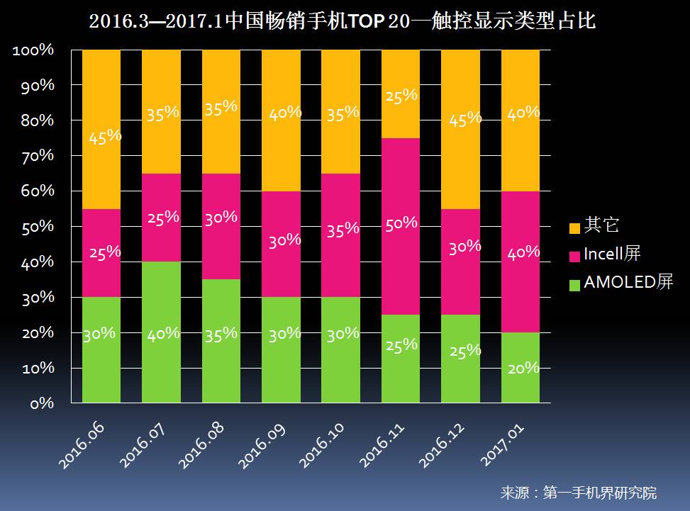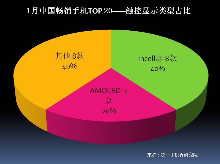 1月中国畅销手机TOP 20中,采用AMOLED屏的为4款,采用incell屏的达到8款,占比提升至40%。