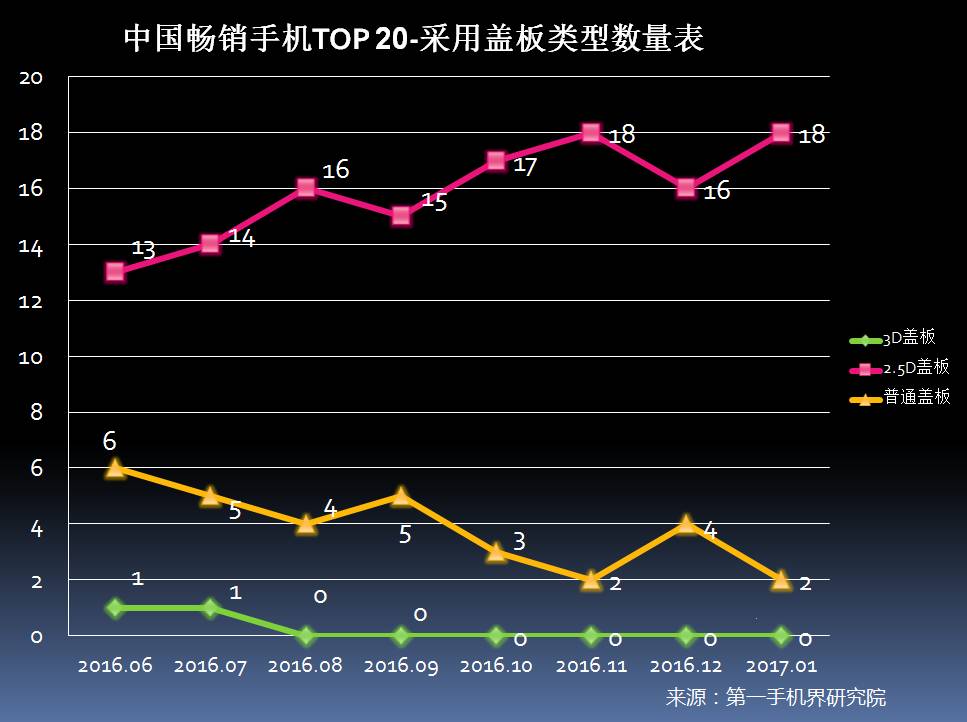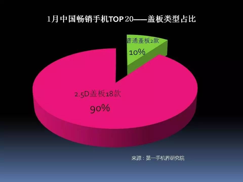 1月中国畅销手机TOP 20中采用2.5D玻璃盖板的机型有18款,占比达到90%,相比12月份提升10%。没有采用2.5D玻璃盖板的手机机型只有2款,占比为10%,售价全部在1300元以下。