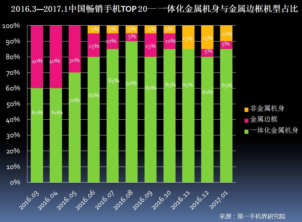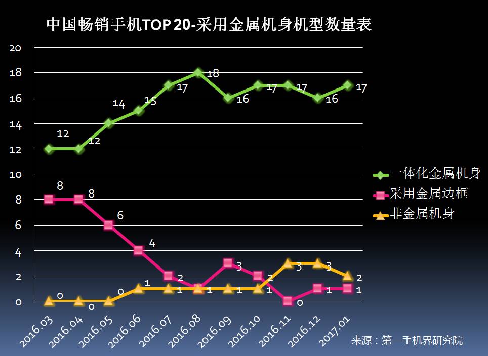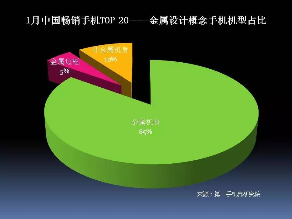 1月中国畅销手机TOP 20,采用一体化金属机身有17款,占比85%,采用金属边框的有1款,占比5%;没有采用金属设计概念的有2款,占比10%,售价均在1300元以下。