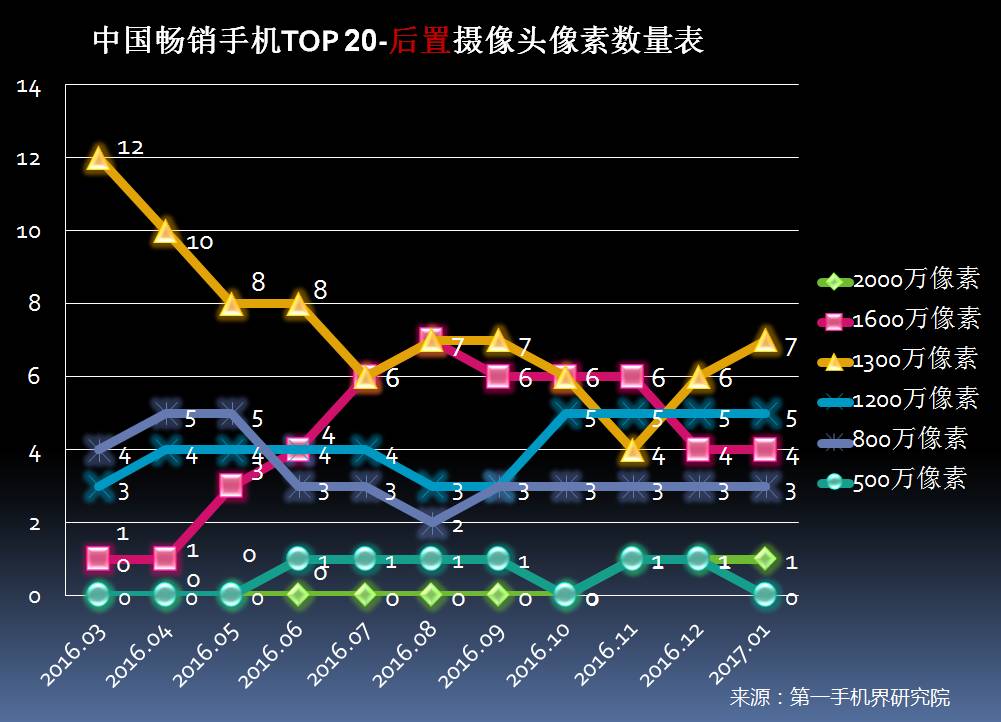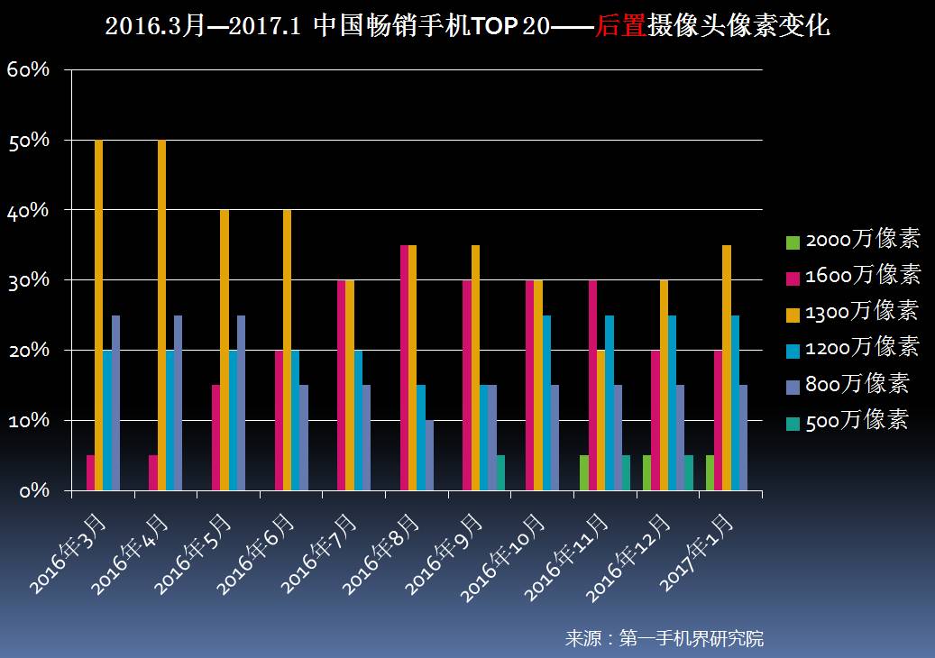 1月畅销手机TOP 20中,后置摄像头采用1600万像素的有4款,占比20%;采用1300万像素的有7款,占比提升至35%。