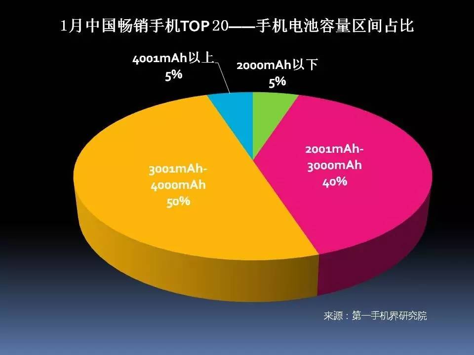 续航能力已经成为手机卖点之一,1月中国畅销手机TOP20中,电池容量3001mAh-4000mAh的机型占比提升到50%。