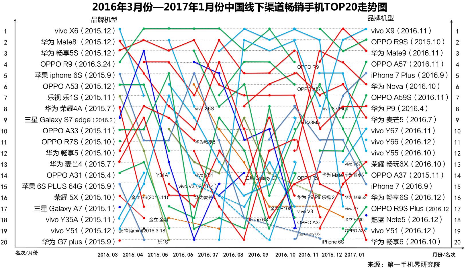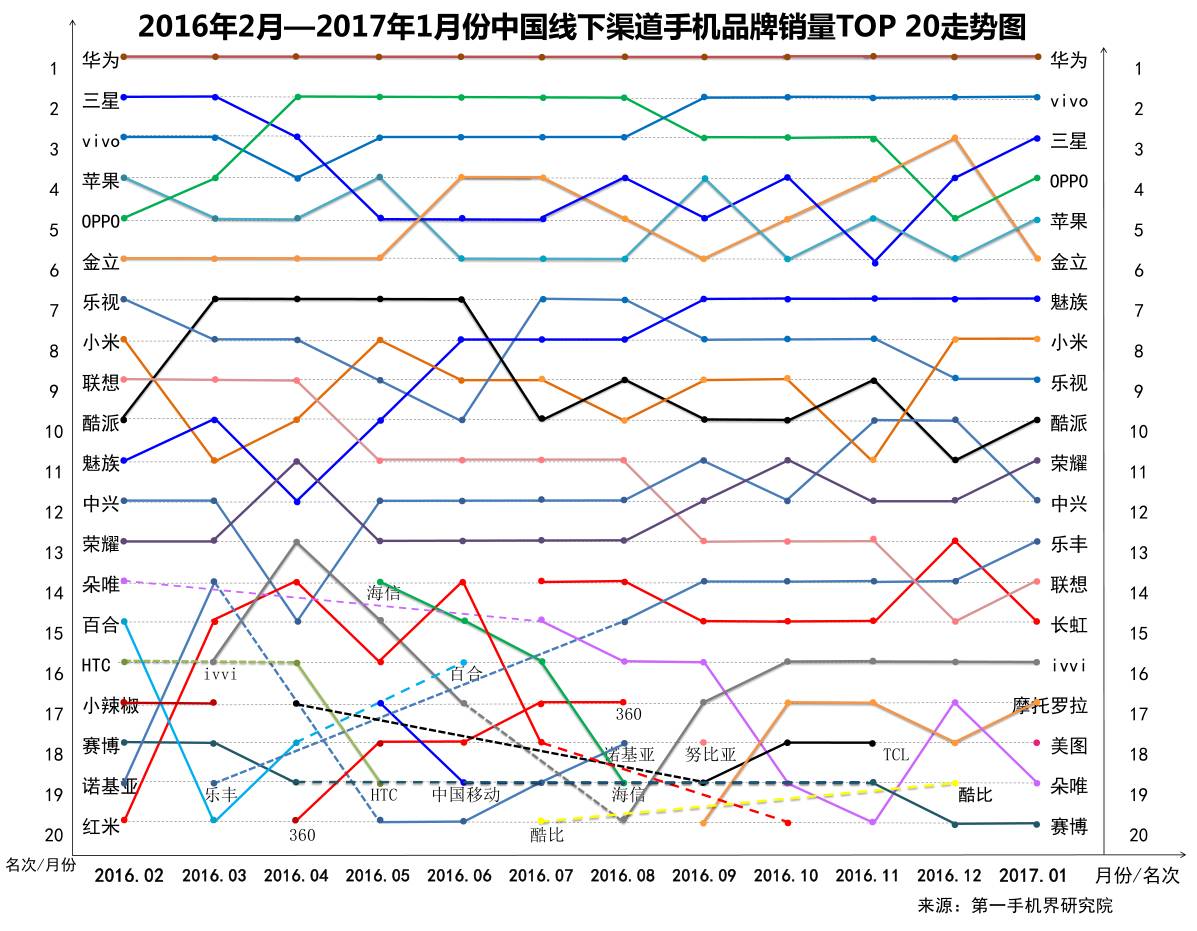 根据迪信通、七星手机连锁、浙江话机世界、广西王者通讯、四川龙翔通讯、广东丽的通讯、广东新星源手机数码连锁、金佳信、黑龙江省凌志手机连锁、海南王者天创、山西太通科技、山西远大通讯、湖南齐欣通讯、江西丽华通讯、湖北九鼎通讯、吉林天天手机、云南九机网、甘肃悦达、陕西中人、河南兄弟通讯商会、河南国宇、河南胜天、江苏国网、河北润德、厦门中桥、贵州诚讯等全国手机连锁卖场销售数据统计结果显示,2017年1月在中国线下渠道销售的手机品牌达到102个,环比2016年12月增加了8.5%,有一定销量的手机机型达到89款,环比2016年12月减少了2.2%。