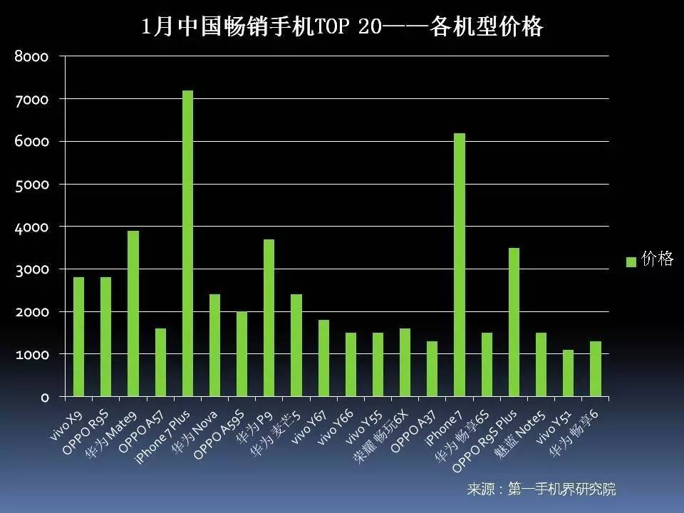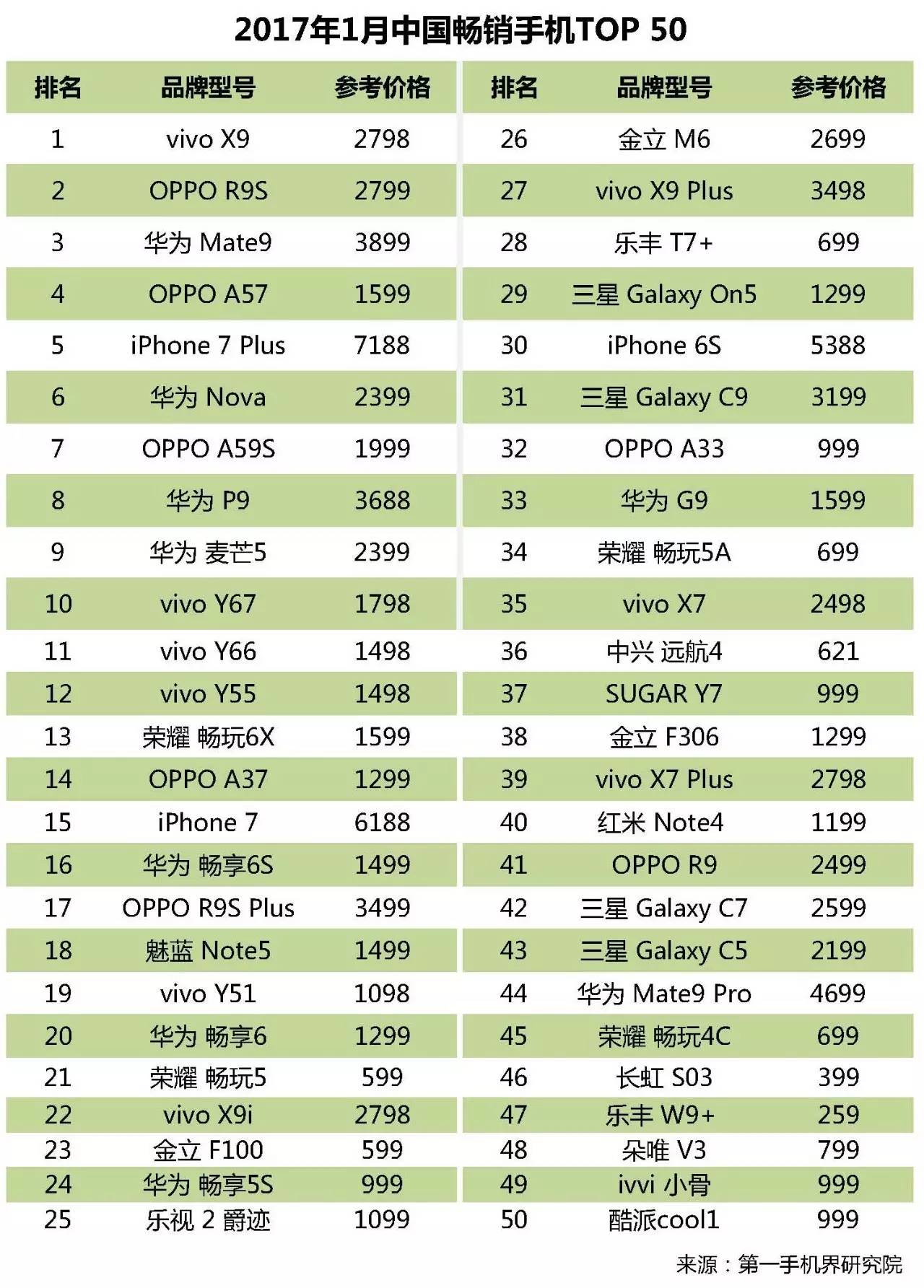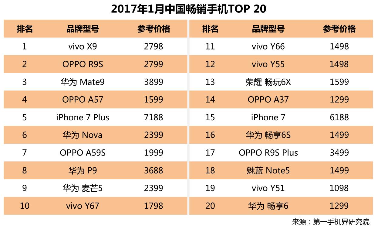 vivo X9、OPPO R9S、华为Mate9、OPPO A57、iPhone 7 Plus、华为 Nova、OPPO A59S、华为P9、华为 麦芒5、vivo Y67成为1月中国畅销手机TOP10。