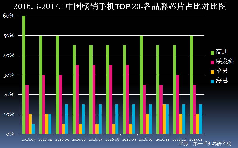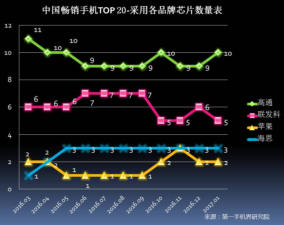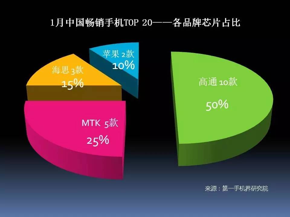 1月中国畅销手机TOP 20中,由于千元以下机型完全缺位,让高通的份额上升至50%。采用MTK芯片的手机平均售价为1579元,最高售价为1999元,而采用高通芯片的手机平均售价为2109元,最高售价为3499元。再次说明MTK在高端手机芯片市场与高通还存在明显差距。
