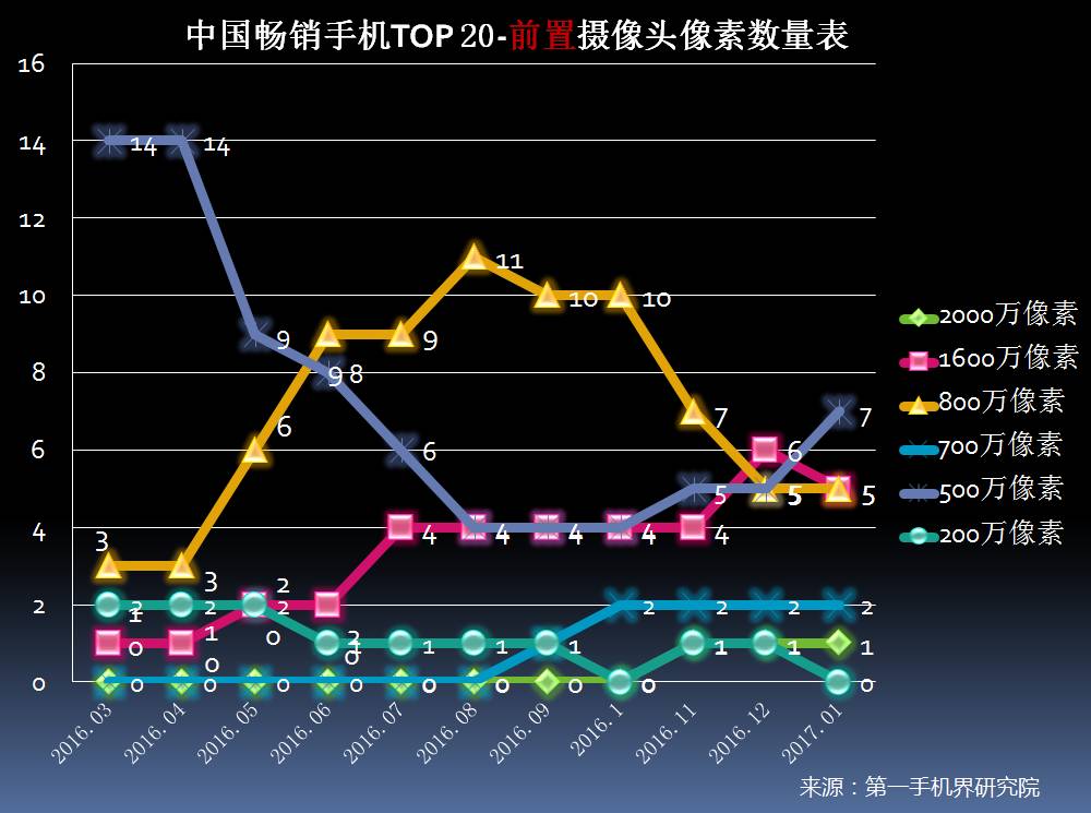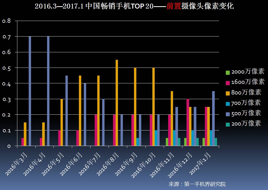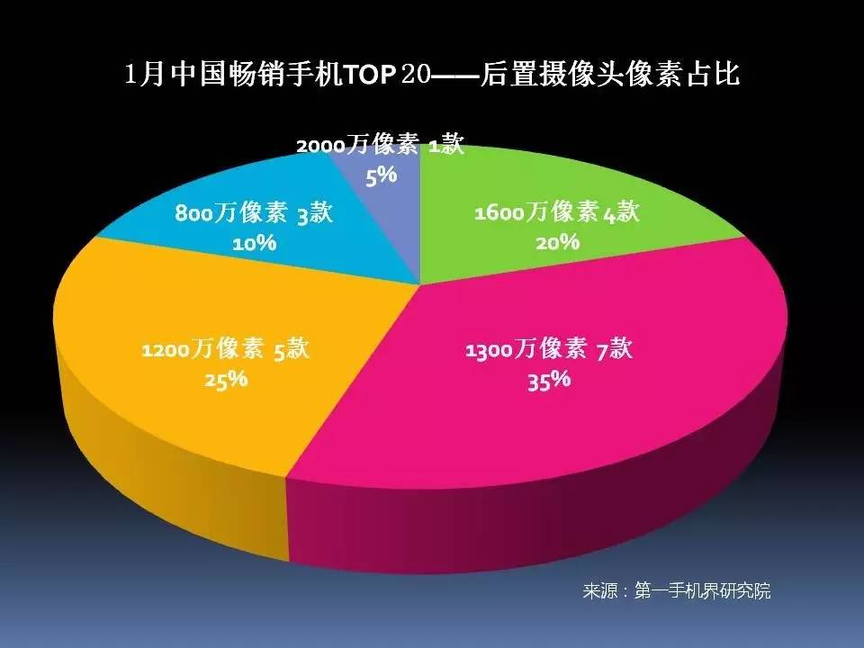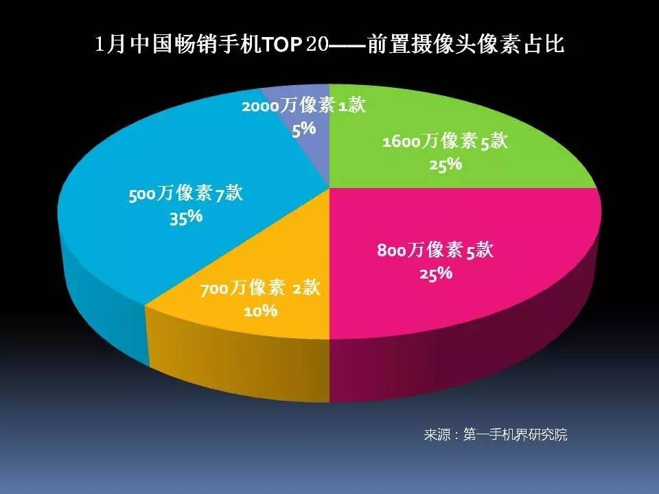 1月中国畅销手机TOP 20中,前置摄像头采用1600万像素的有5款,占比25%;采用800万像素有5款,占比25%。