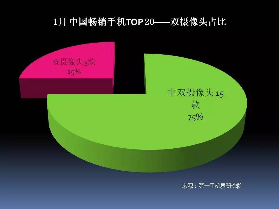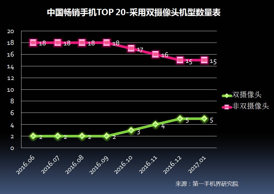1月中国畅销手机TOP 20中,华为mate9、华为P9、vivo X9、iPhone 7 Plus和荣耀畅玩6X五款采用双摄像头设计,占比上升至25%。