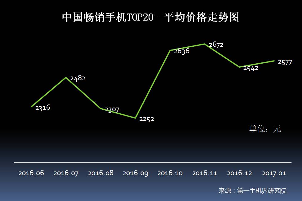 20款畅销手机平均价格在2577元,相比12月2542元,提升了1.4%。中国市场畅销手机平均价格在过去的半年里提升了11.27%。