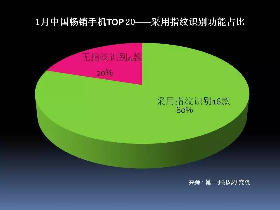1月中国畅销手机TOP 20,采用指纹识别功能的手机有16款,连续7个月占比达到80%以上,没有采用指纹识别功能的手机有4款,占比为20%,售价全部在1500元以下。