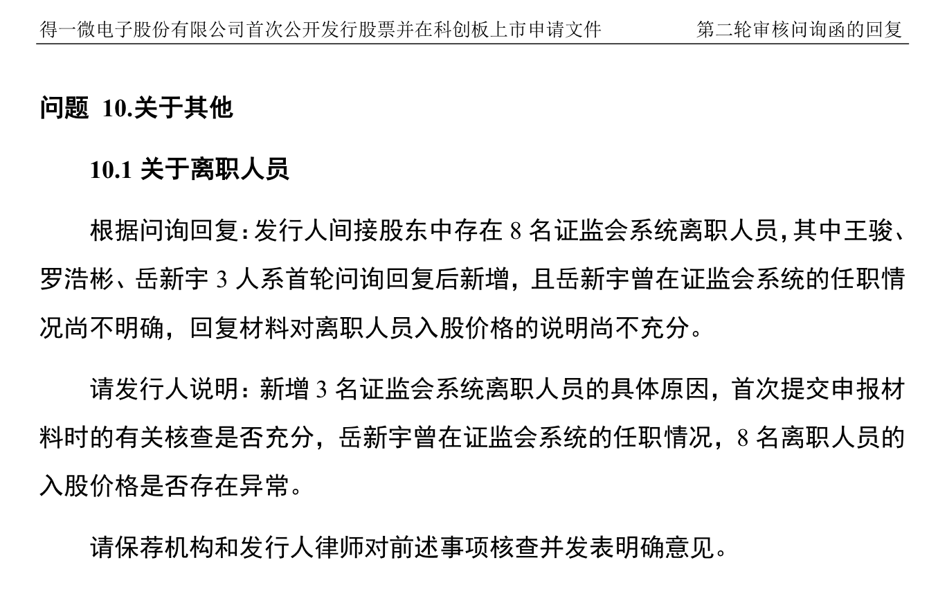 2024年3月30日得一微电以公司及保荐人撤回的方式终止IPO的得一微,在问询中,监管层就要求公司解释说明间接股东中存在8名证监会系统离职人员的具体情况。
