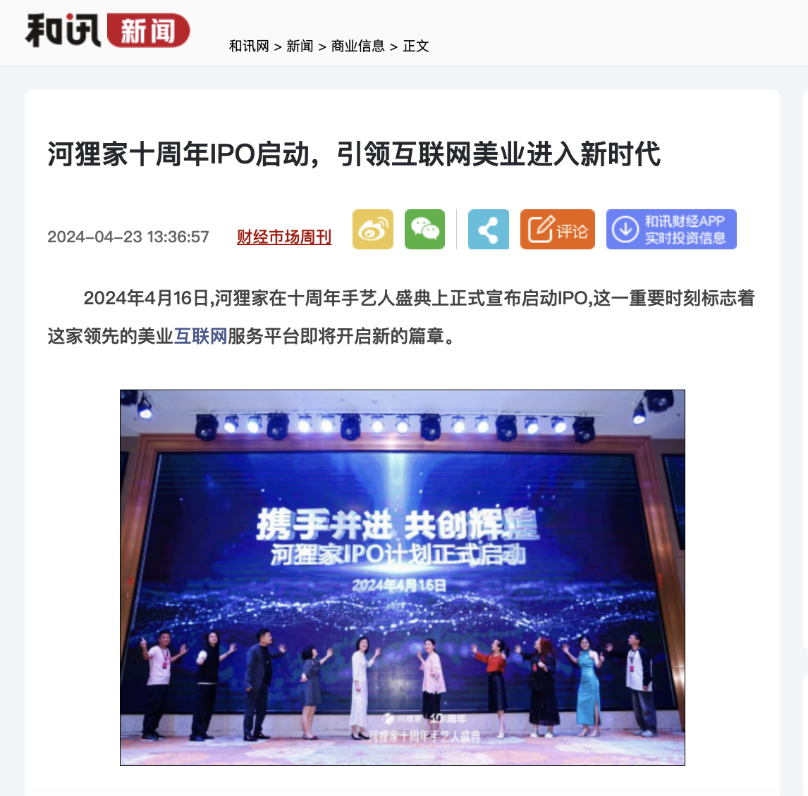 2024年4月,和讯新闻报道,河狸家在其十周年手艺人盛典上正式宣布启动IPO。