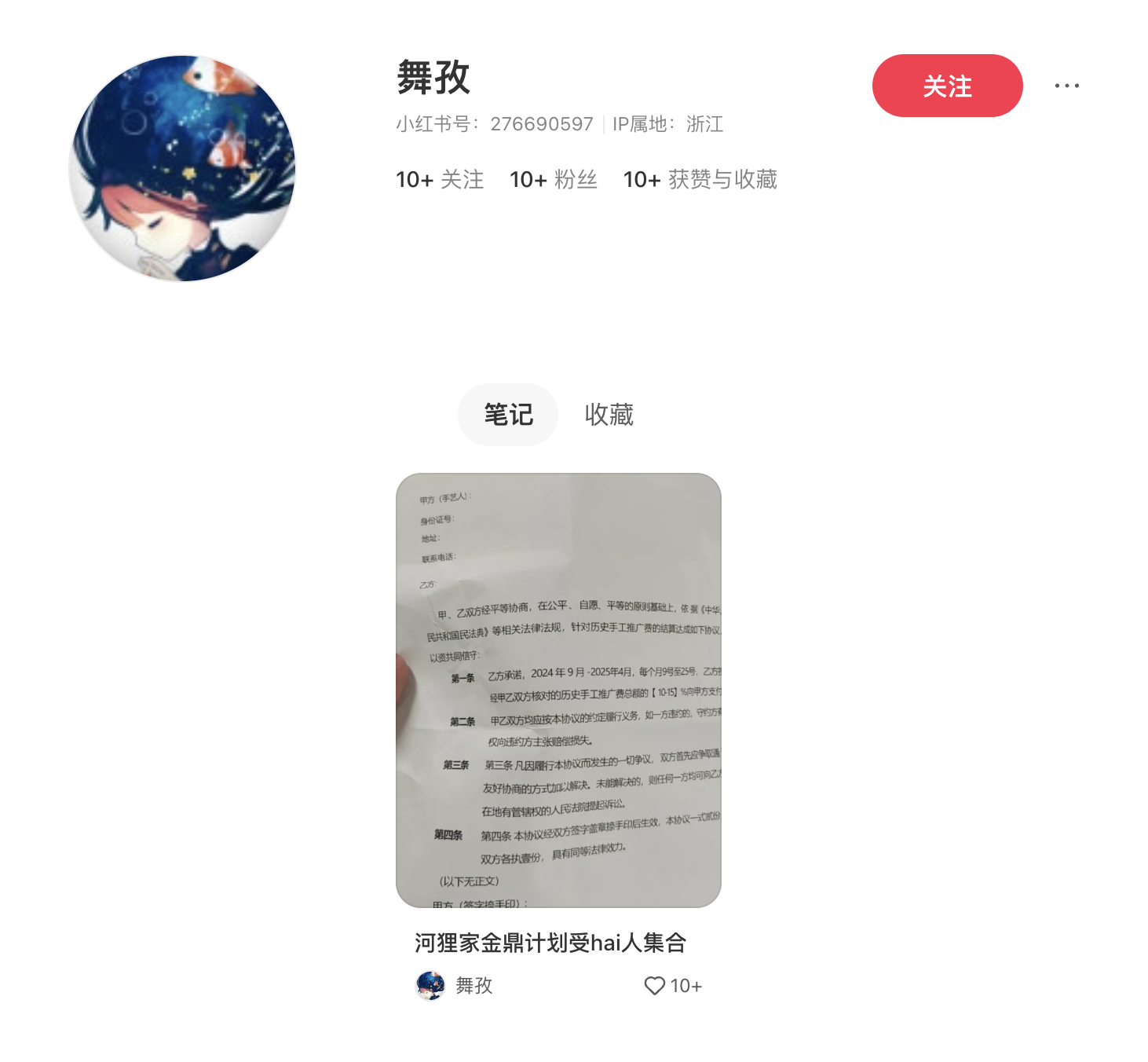 其小红书账号于9月6日发布了一条名为“河狸家金鼎计划受害人集合”的帖子,帖子中发布了《历史手工推广费结算方案协议书》的图样,并以受害者的身份控诉河狸家,但亦对选择相信河狸家、签署协议的手艺人表示理解。