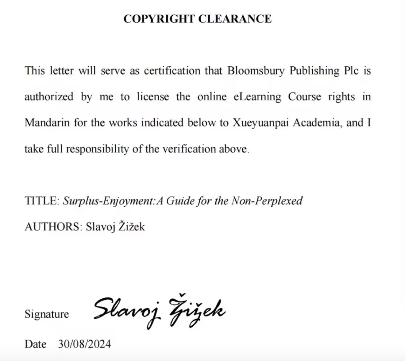 一周后,学院派在b站账号发布了齐泽克授权的官方声明《我有分成、没人撒谎、攻击者滚蛋!》,隔天又上传了有关课程的的正式法律签署文件。文件显示,齐泽克同意了学院派将其书籍《Surplus-Enjoyment》 制作成在线课程的想法,但并不认为基于书籍制作后的课程属于他的作品。学院派则附上解释称,齐泽克关于课程参与和著作权归属方面的想法,与学院派当时签署的合同中的条款,以及与作者的实际沟通过程有出入,认为这是沟通不良导致的后果,并在接下来的48小时内接受办理消费者的退款请求。截至目前,课程海报上有关齐泽克是主讲人的信息已被抹除,事件暂告一段落。