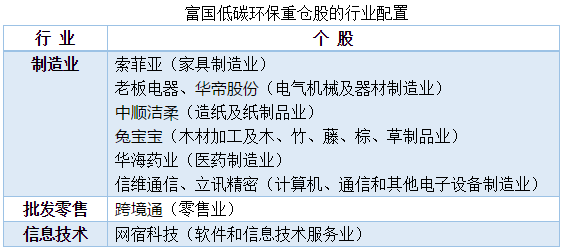 据富国低碳环保2016年四季报数据,制造业持仓市值45.14亿元,占基金净值比74.03%;批发零售业6.45亿元,占基金净值比10.58%;信息技术5.56亿元,占基金净值比9.11%。