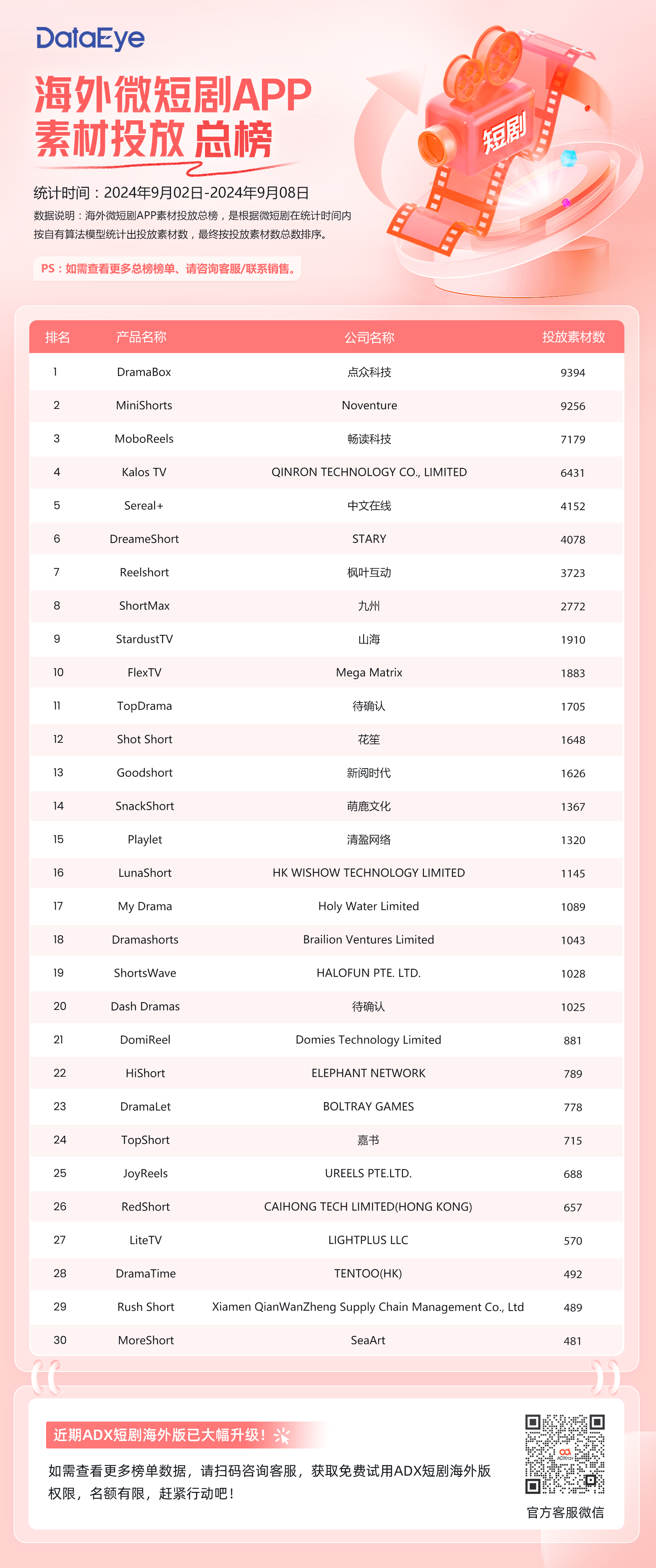 本期(9月2日-9月8日)DataEye海外短剧APP素材投放榜,点众科技旗下的DramaBox持续登顶,投放素材数达9394组,Noventure旗下的MiniShorts稳居第二,MoboReels本期回归第三。值得关注的是,本期海外短剧APP素材投放数量整体上涨,且头部效应明显,TOP10的APP几乎没有变化,仅在排名上略有变换