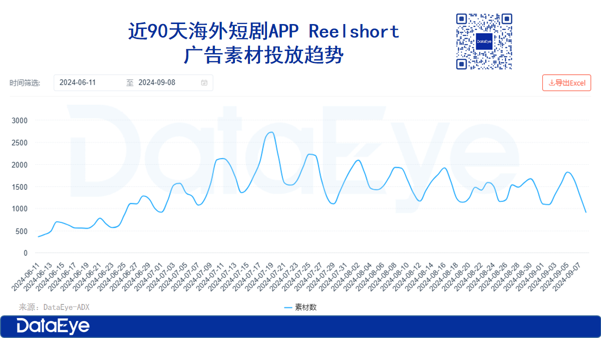 本期分析的主要案例是Reelshort。在短剧风格方面,ReelShort主打精品欧美短剧,其演员多为欧美面孔。今年第二季度起,加大了对短剧广告素材的投放。近90天以来,Reelshort的广告素材投放趋势呈现出波动上升的特点,在7月19日达到最高值2725组。
