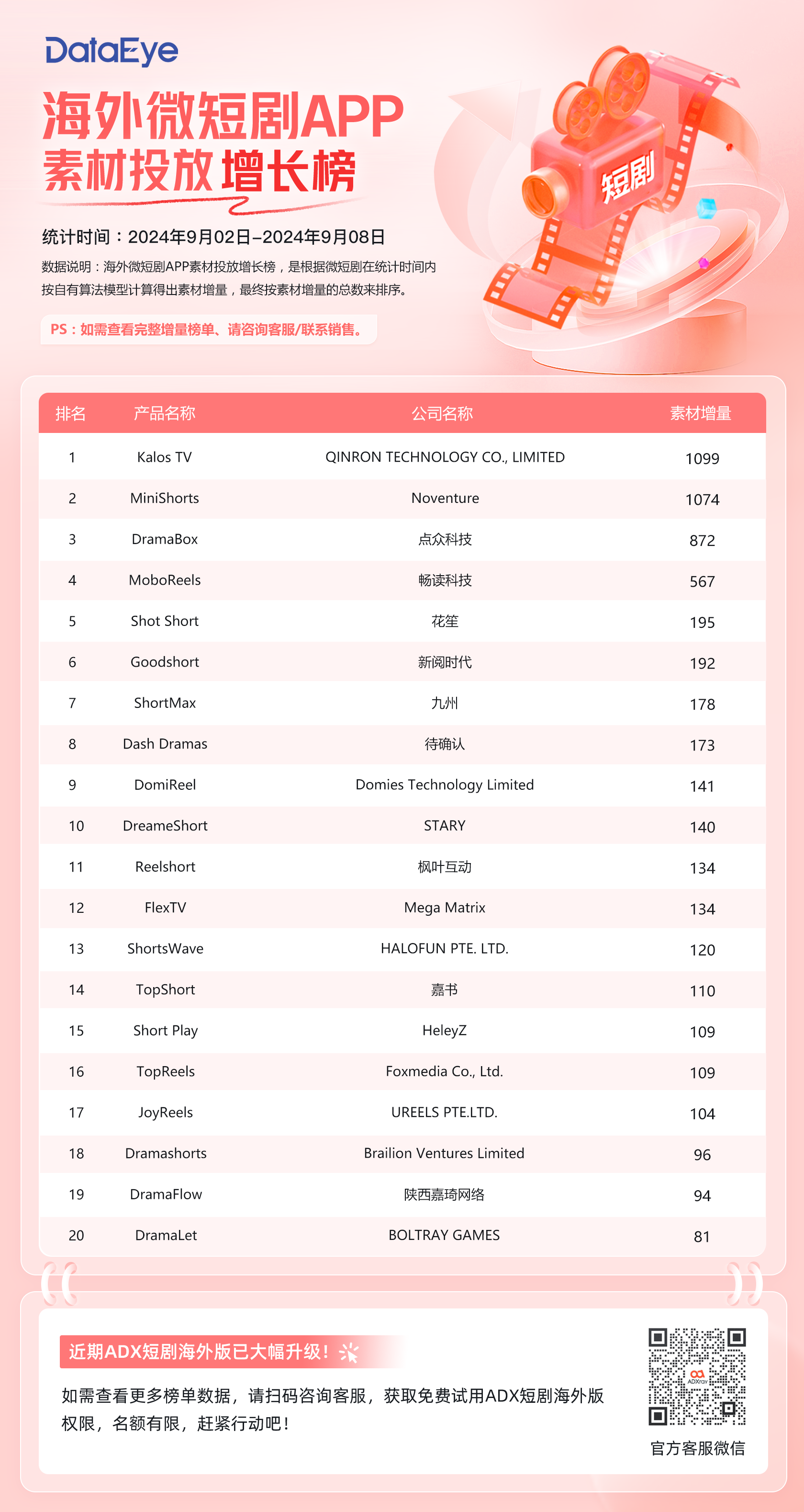 本期(9月2日-9月8日)DataEye海外短剧APP素材投放增长榜,Kalos TV、MiniShorts和DramaBox包揽素材投放增长榜TOP3。MoboReels和Shot Short分别位列第四和第五位。MiniShorts和DramaBox依旧稳居素材增长榜TOP3,MoboReels重回增长榜TOP5,花笙旗下的Shot Short表现强势,本期闯入增长榜TOP5。