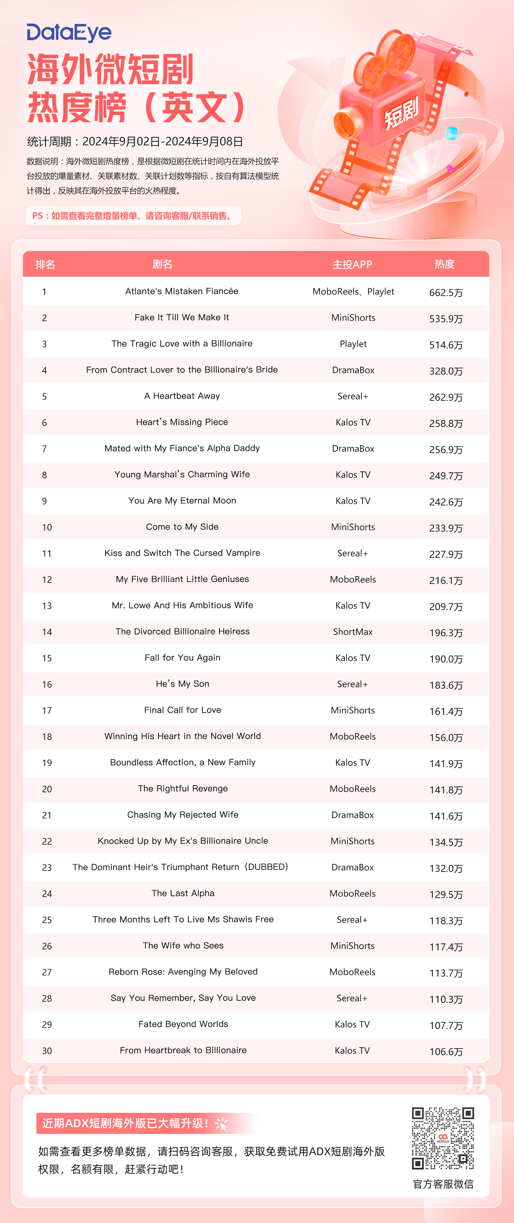 本期(9月2日-9月8日)DataEye海外短剧热度榜英文榜,短剧《Atlante's Mistaken Fiancée》登顶,主投MoboReels和Playlet,热度超660万;《Fake It Till We Make It》第二;《The Tragic Love with a Billionaire》位列第三。