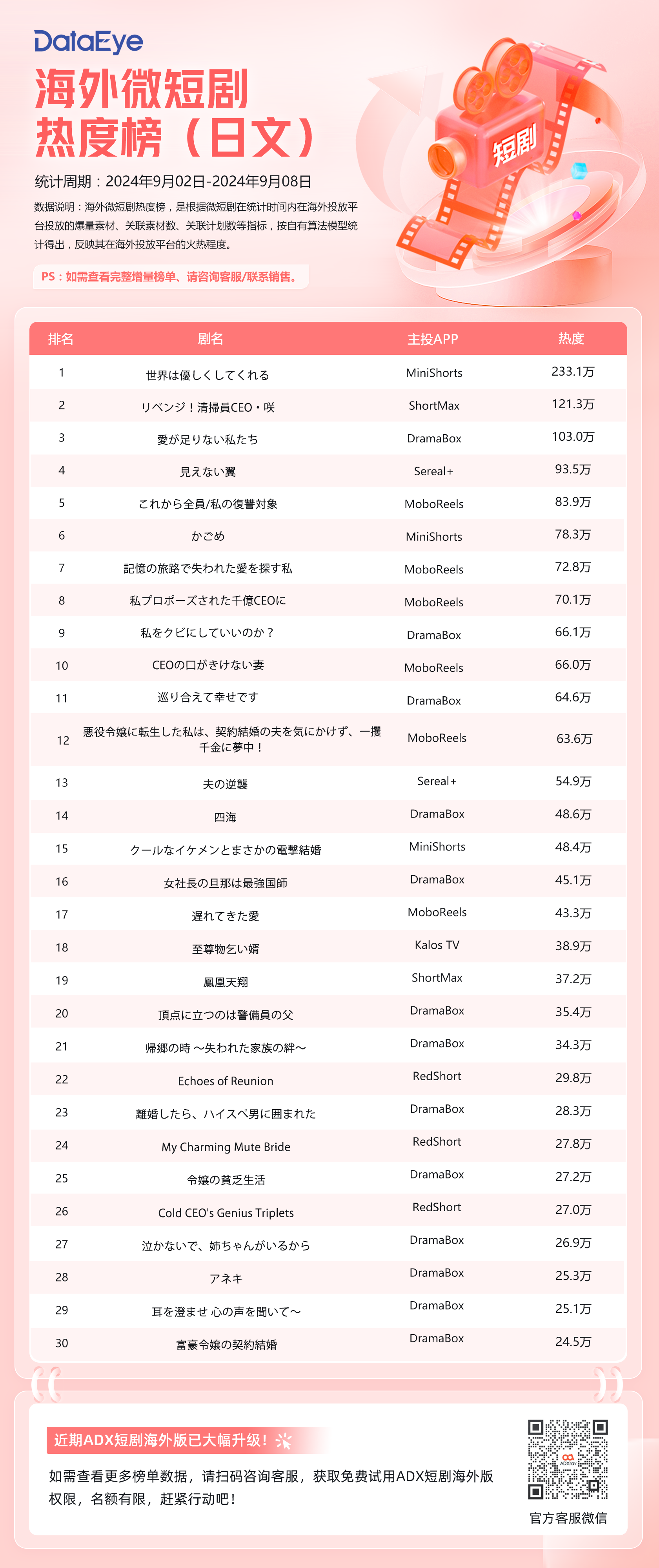 本期(9月2日-9月8日)DataEye海外短剧热度榜日文榜,《世界は優しくしてくれる》登顶,热度接近超230万;《リベンジ!清掃員CEO・咲》第二,热度超120万;《愛が足りない私たち》位居第三,热度达103万。