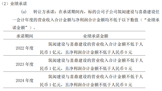 协议规定,股份转让方承诺,2022年、2023年及2024年,筑闳建设与喜鼎建设的营业收入合计金额均不低于1亿元,且净利润合计金额均不低于0元。