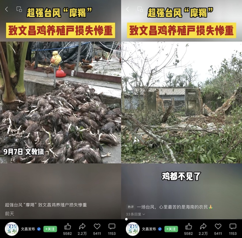 文昌发布报道称,当地文昌鸡养殖户表示鸡棚都被台风吹走了,鸡受到惊吓被压死了。此外,有养殖户反映,鸡、牛都不见了,水稻也遭到破坏。一位文昌市文教镇的养殖户称,这次台风损失惨重,有500只鸡死了,看到后非常痛心。