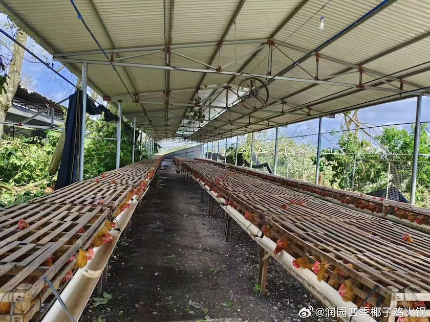 “是有部分走地鸡吹没了。”深圳椰子鸡火锅品牌“润园四季”告诉界面新闻,但品牌同时表示暂不影响供应,“我们家文昌鸡的养殖分为孵化、椰林散养、笼养育肥,图片中的鸡舍是育肥舍,在建设之初就搭建得很牢固,台风预警之后,我们提前把部分椰林散养的走地鸡抓到育肥舍了。”