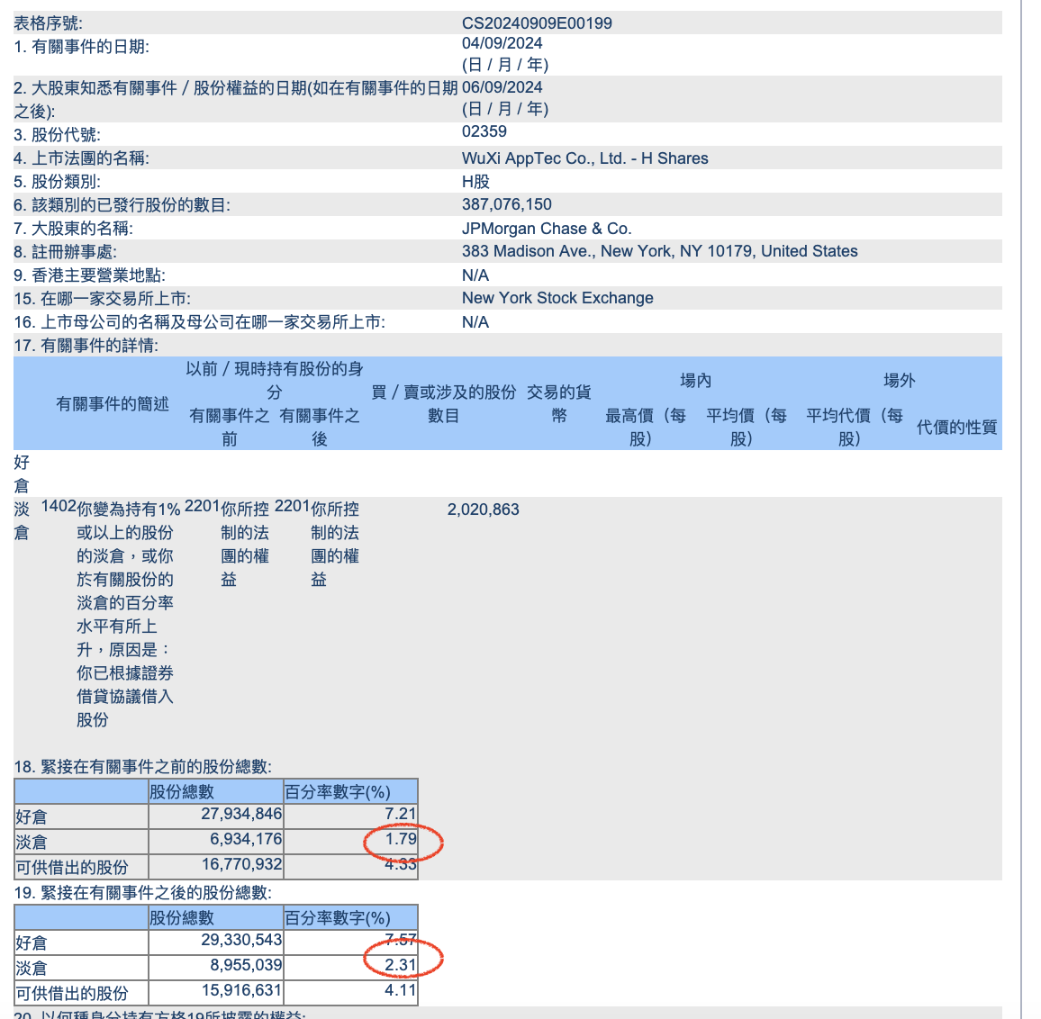 9月10日,港交所文件显示,摩根大通在药明康德的空头头寸持仓比例于9月4日从1.79%上升至2.31%。