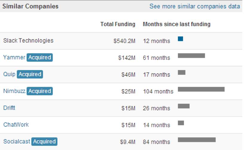 Slack与竞争对手的总融资金额与融资间隔期对比图(数据来源:CB Insights)