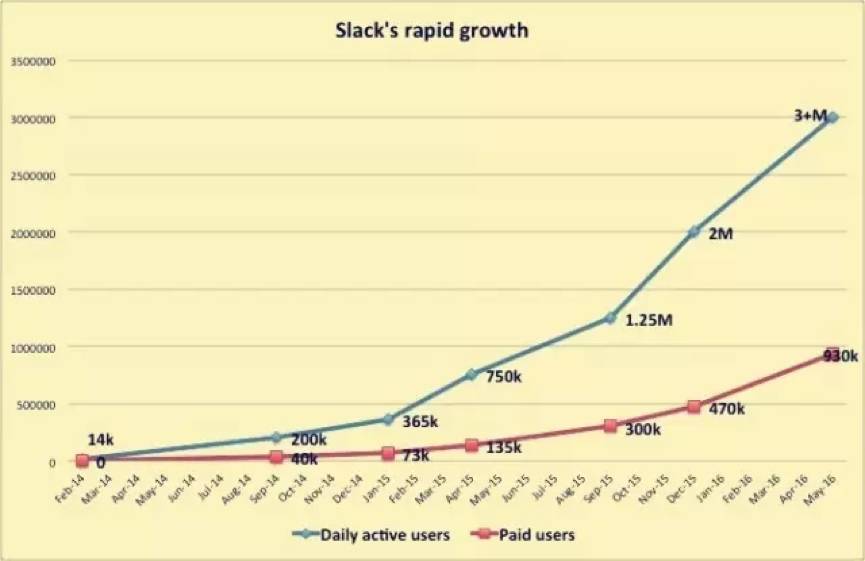 Slack,美国公司,诞生于2013年,由于功能设计完善,在测试期间就赢得了相当好的用户口碑。2014年2月,Slack于美国市场正式推出的首日,便有8000多家公司进行注册,半年后日活跃用户达到2.5万、付费企业超过2000家。2016年其F轮融资2亿美元, 距E轮融资仅隔341天,不到一年时间,估值已增长至38亿美元,显见市场对其的青睐。