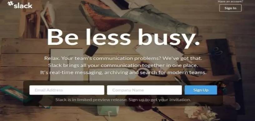 Slack创立初期网站首页写着大大的「Be Less Busy」下方再写下「Relax. Your team's communication problems? We've got that.」,以幽默风趣的口吻道出用户心声,让Slack瞬间成为一位懂得用户需求的贴心办公伙伴。