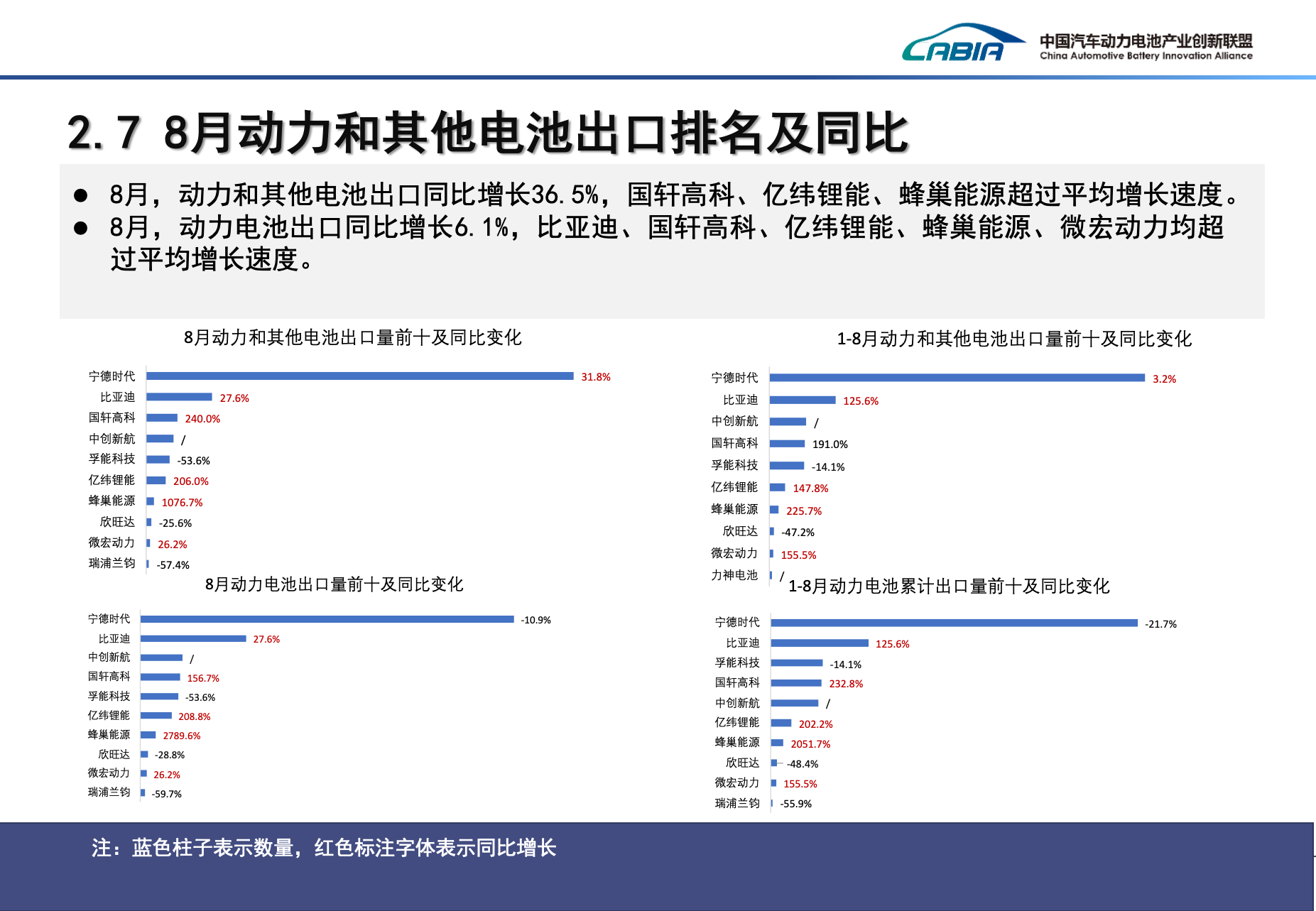 今年前八个月,宁德时代动力电池累计出口量下滑了21.7%,但依旧稳居国内榜首;排名第二的比亚动力电池出口量同比增长了125.6%。