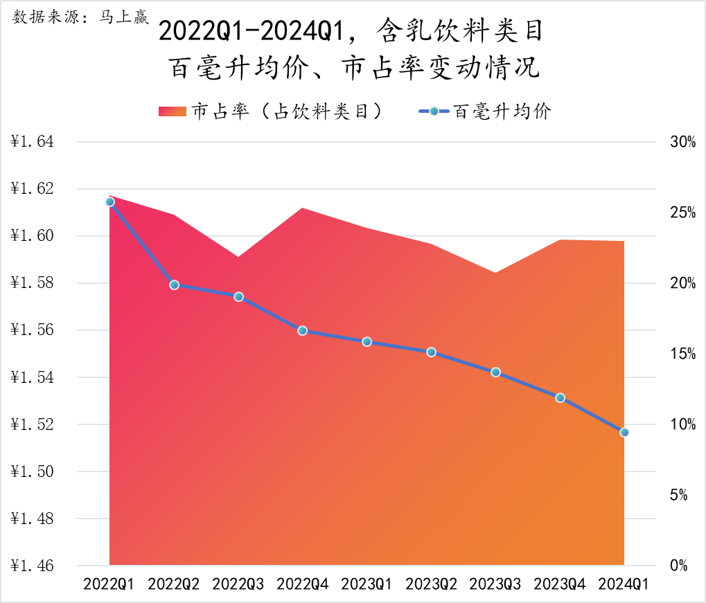 2022年至今,整个含乳饮料(包括乳酸菌饮料和乳饮料)类目都面临着较大挑战。含乳饮快消数据监测公司马上赢品牌CT的数据显示也证实,料在过去数年中一直是中国饮料市场中的最大类目,常年占据着整体饮料大盘约1/4的市场份额。在过去两年中,含乳饮料的市场占有率和每百毫升均价都呈现出下滑趋势。