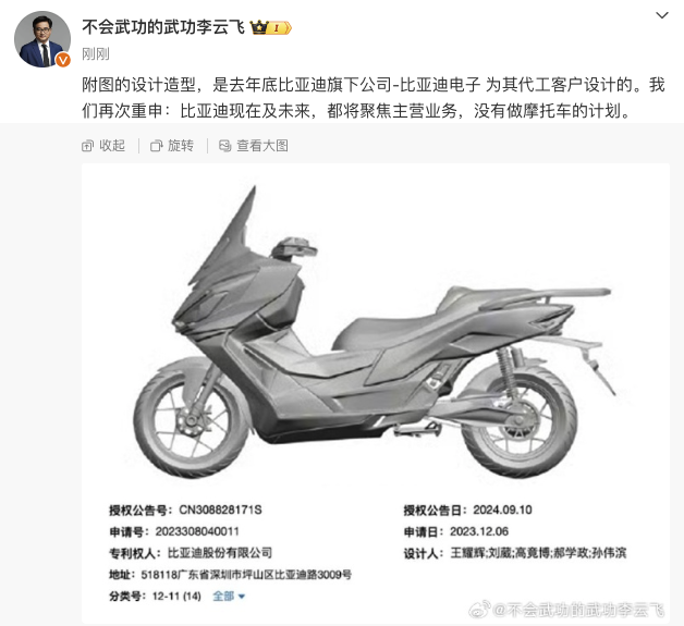 9月12日,比亚迪集团品牌及公关处总经理李云飞在微博发布声明称,相关电动摩托车设计造型,是去年底比亚迪旗下公司-比亚迪电子为其代工客户设计的,“我们再次重申:比亚迪现在及未来,都将聚焦主营业务,没有做摩托车的计划”。