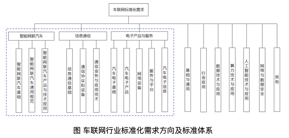 重点车联网标准方向主要包括基础与通用、行业应用、数据技术与应用、算力技术与应用、人工智能技术与应用、网络与数据安全等,如图所示。