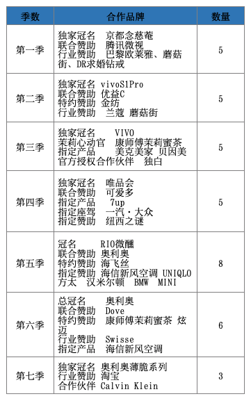 从合作品牌的数量来看,前四季节目的合作品牌均有5家,第五季到达合作数量的巅峰有8家,而第七季度则进入断崖式下跌的局面,仅有3家。