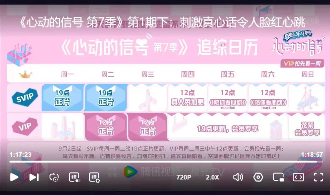 行至第七季,《心动的信号》累积了一定量级的忠实观众,通过抽周边大礼包、赢签名照等方式吸引更多用户成为付费会员。与此同时,《心动的信号7》还在探索付费会员的更多玩法——在 VIP提前看的基础上,推出SVIP提前看模式,即SVIP提前17小时看正片、提前7小时看真人秀加更以及衍生内容《陪你看心动》。