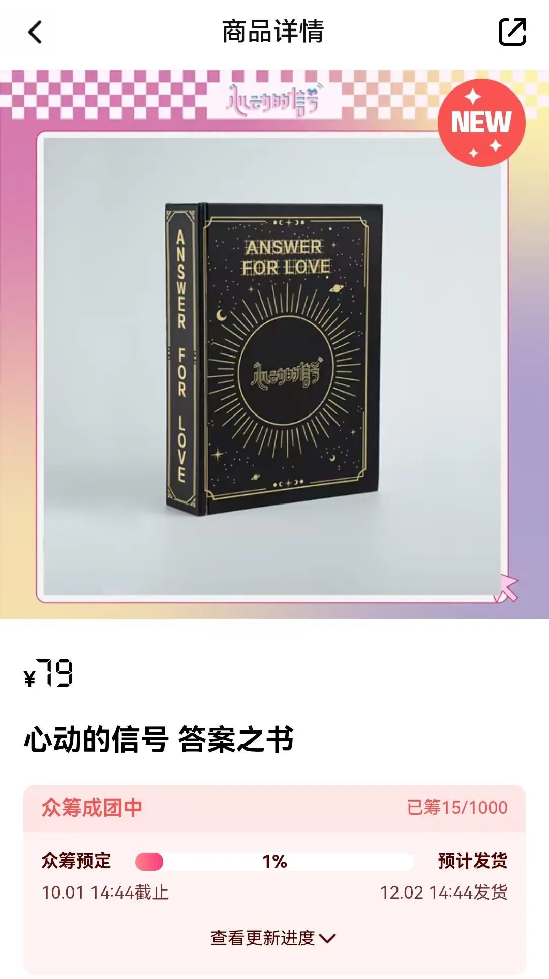 读娱君注意到,排在热卖前三名的是59元的吸管杯、79元的答案之书和12.8元的钥匙扣,其中,答案之书采用众筹成团的形式销售,目标是1000份,不过截至稿前只众筹了15份,而这一销量对应位居第三名的成绩,似乎也预示着《心动的信号7》的周边产品销售开局不甚理想。
