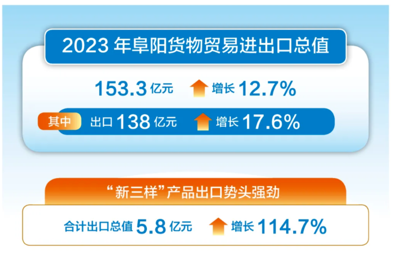 2023年,阜阳货物贸易进出口总值153.3亿元,同比增长12.7%,增速高于全省4.8个百分点。其中,出口138亿元、增长17.6%。“新三样”产品出口势头强劲,合计出口总值达5.8亿元、增长114.7%。