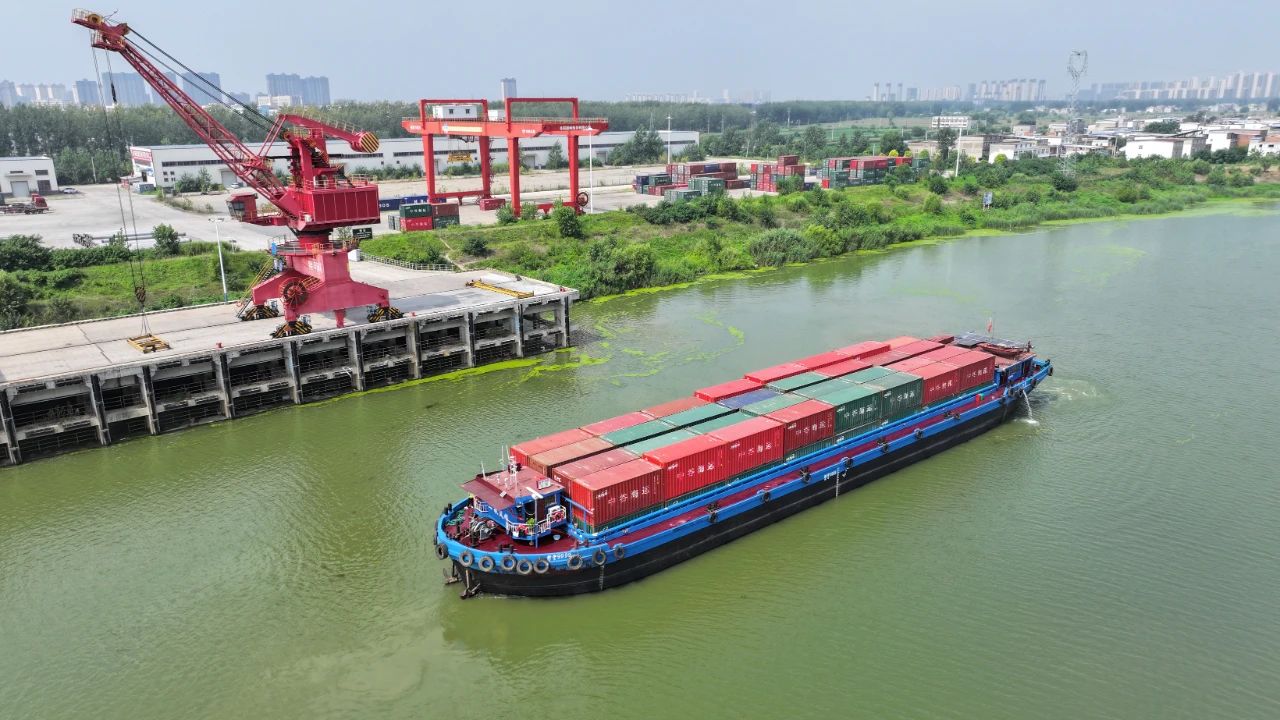 装满集装箱的货船从阜阳颍州港出发,经江淮运河直达长江,水运通道较原通道缩短200公里至600公里。