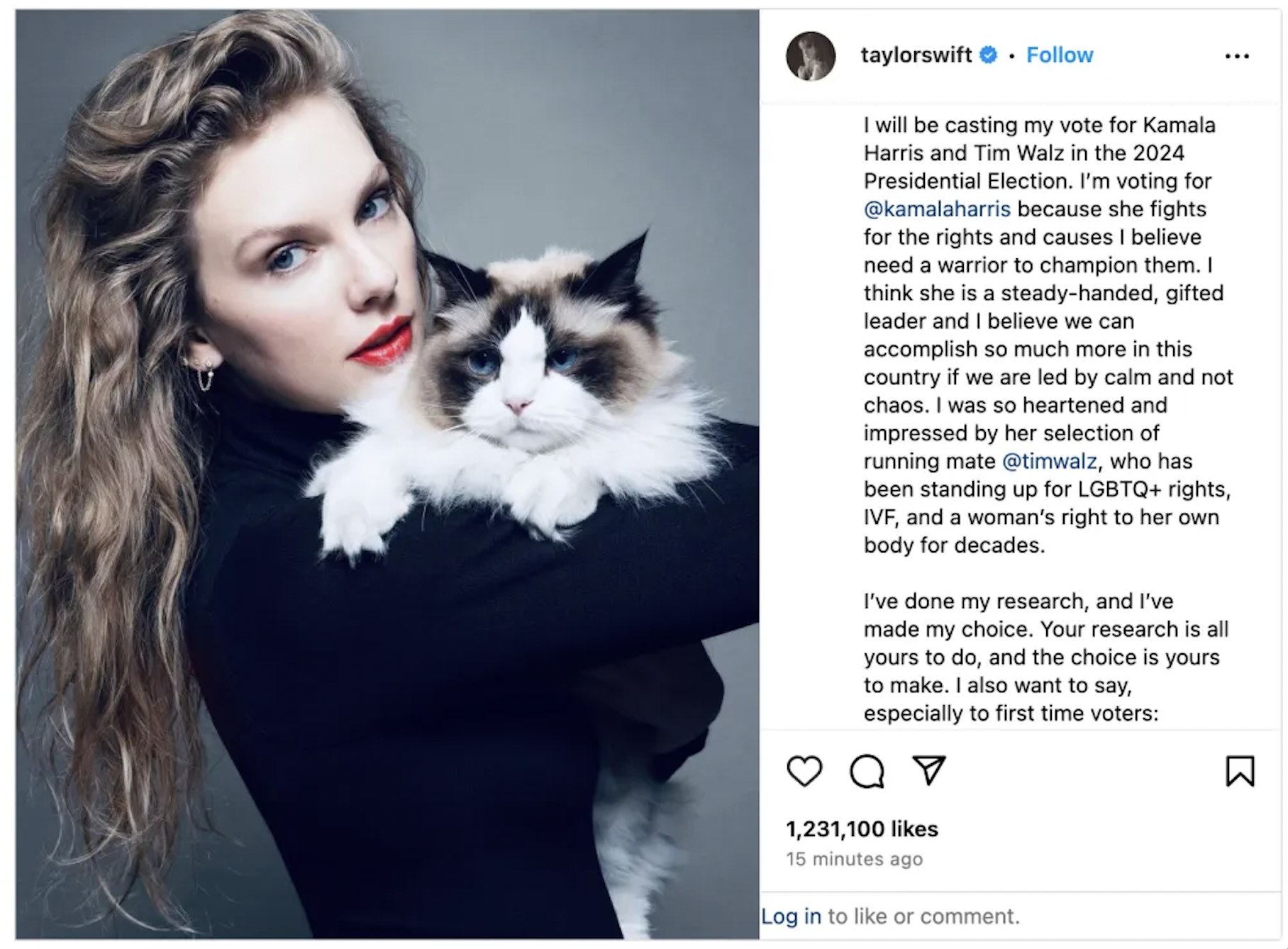 泰勒在帖文中表示,最近在网络上流传着她支持特朗普的AI合成内容,并被特朗普的网站转发,因此,她决定公开自己的投票选择,这是抵制虚假信息最容易的办法。泰勒进一步写道,自己支持哈里斯,因为她是一位稳健且有才干的领导者,正在为需要被捍卫的权利和事业而战,而她的竞选搭档蒂姆·沃尔兹几十年来一直在支持试管婴儿以及女性对自己身体的权利,令人振奋和钦佩。她对关注者说:“现在是一个很好的时机,去研究这些候选人在你最关心的议题上的立场。……我已经做了研究,并做出了自己的选择。你的研究由你自己来做,选择也由你来做出。”