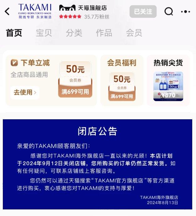 9月12日,欧莱雅旗下护肤品牌TAKAMI正式关闭品牌的天猫海外旗舰店,截至闭店前,该店铺粉丝数为35.7万。目前,在天猫平台,品牌的天猫官方旗舰店仍保持正常营业。