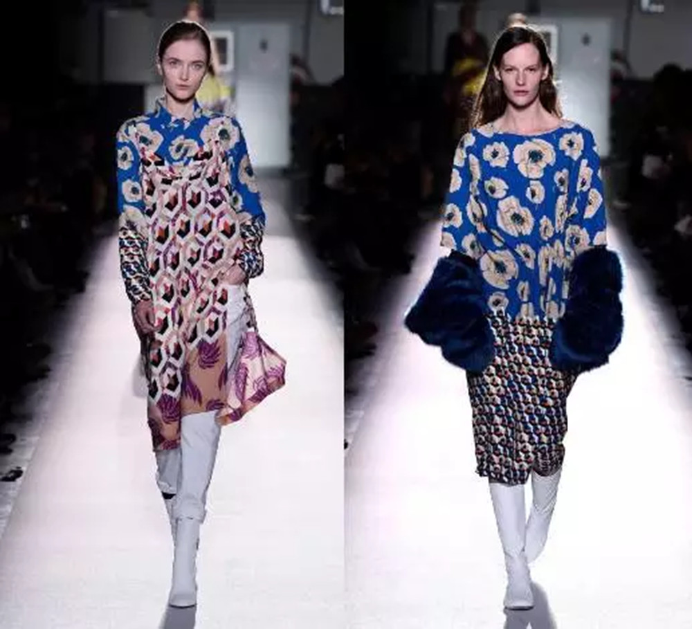 新系列中,Dries Van Noten将浪漫的玫瑰图案上与鲜明的几何元素或彩色皮草组合在了一起。在高饱和度宝蓝色的映衬下,象征着古典美的玫瑰透出了现代的芬芳。