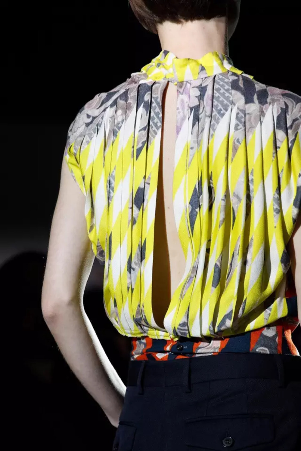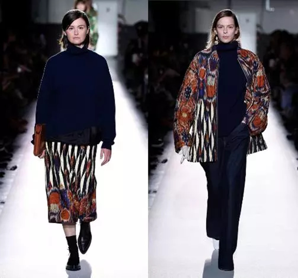 历史悠久的纱线扎染织物(ikat)工艺,常见于印度和东南亚地区,由于常常能诞生出人意料的印花结果而成为许多设计师的灵感源泉。Dries Van Noten也曾深深为纱线扎染着迷,今年他在鲜艳的纱线扎染印花上加上古典的黑白几何图案,穿在身上产生一种别具风格的优雅。