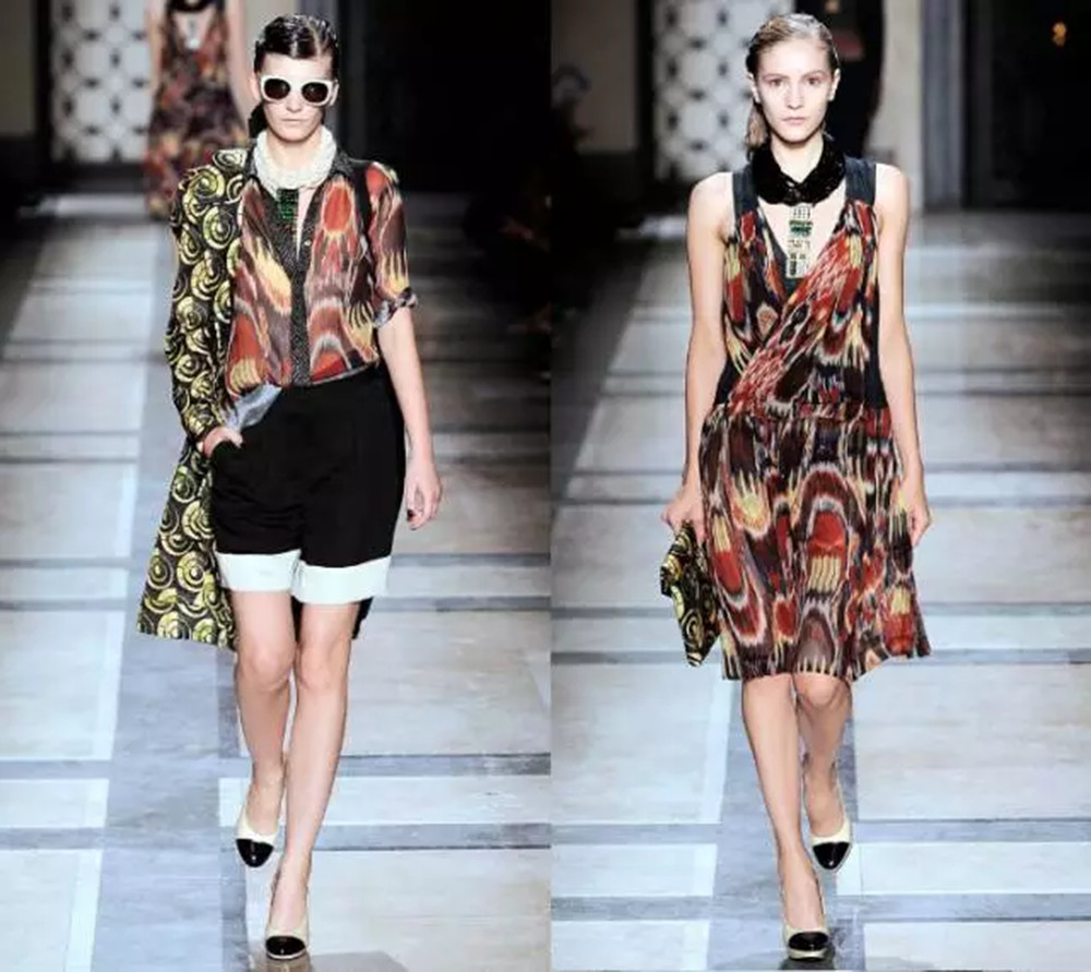 Dries Van Noten最初是在2010年春夏系列中大量使用到了纱线扎染印花,这是一个高度装饰的系列,而设计师成功地在保持设计特色的同时展现出新的内容。