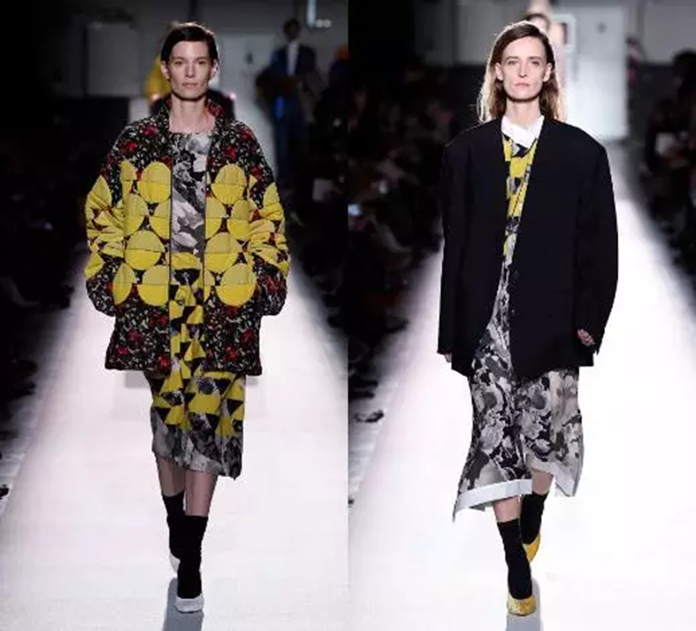 单色花卉印花是过去一季的重点元素,而Dries Van Noten却将它作为一种底色,叠加上了明黄色的圆形图案,让服装的整体层次显得丰富而有动感。