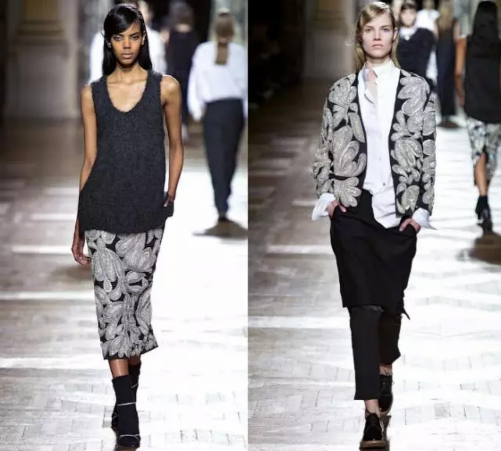 不过,Dries Van Noten在这季并非简单地重现过往元素,而是完成了一次真正的重新诠释:他把来自1994年春夏到2013年秋冬的印花重新打乱、重叠、组合在了全新的廓形上,穿在曾走过这片T台的模特身上。