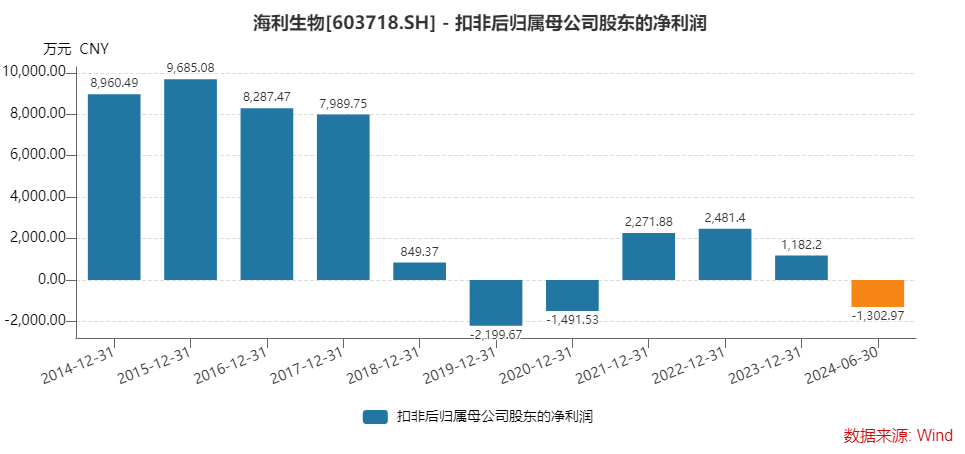 多年来,该公司主业增长乏力。财务数据显示,自2015年上市以来,海利生物营业收入未能突破3.5亿元,2022年、2023年及2024年上半年分别同比下滑13.62%、19.76%、9.5%,2023年全年营收跌至2.41亿元。