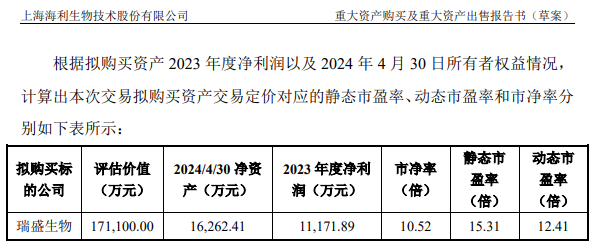 海利生物重组报告书认为,本次交易瑞盛生物的评估值对应静态市盈率为15.31倍,动态市盈率为12.41倍,均低于市场可比交易平均值;市净率为10.52倍,高于市场可比交易平均值,要原因系瑞盛生物于2024年初分红8511.23万元使评估基准日净资产下降较多所致。