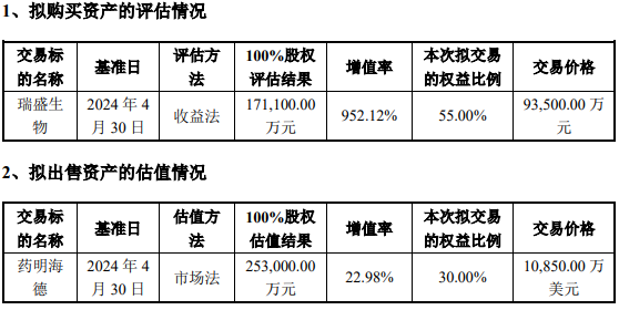 海利生物8月30日公告,拟以支付现金方式向美伦管理购买其持有的瑞盛生物55%股权资产,作价93500万元;同时,拟向药明生物(02269.HK)出售其持有的药明海德30%股权,作价10850万美元。