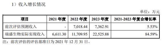 其中,前次评估中预测2022年度至2026年度收入的年平均复合增长率为3.2%,其中2021年度至2023年度预测复合增长率5.53%,而瑞盛生物在此期间的实际收入复合增长率为84.59%。