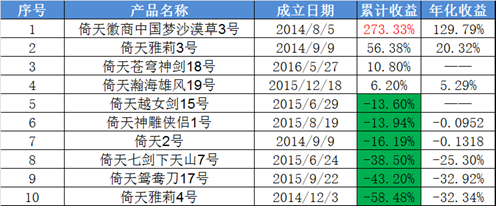 据悉,倚天投资旗下产品超过50只,已清盘的占了近一半。其中,清盘产品大部分是2014年下半年发行的。公司近期已披露净值的基金产品共有10只,累计平均收益率为-11.53%。其中,倚天徽商中国梦沙漠草3号净值虽有一定程度的回撤,但是还维持在3以上,而倚天雅莉4期则在0.4左右徘徊。